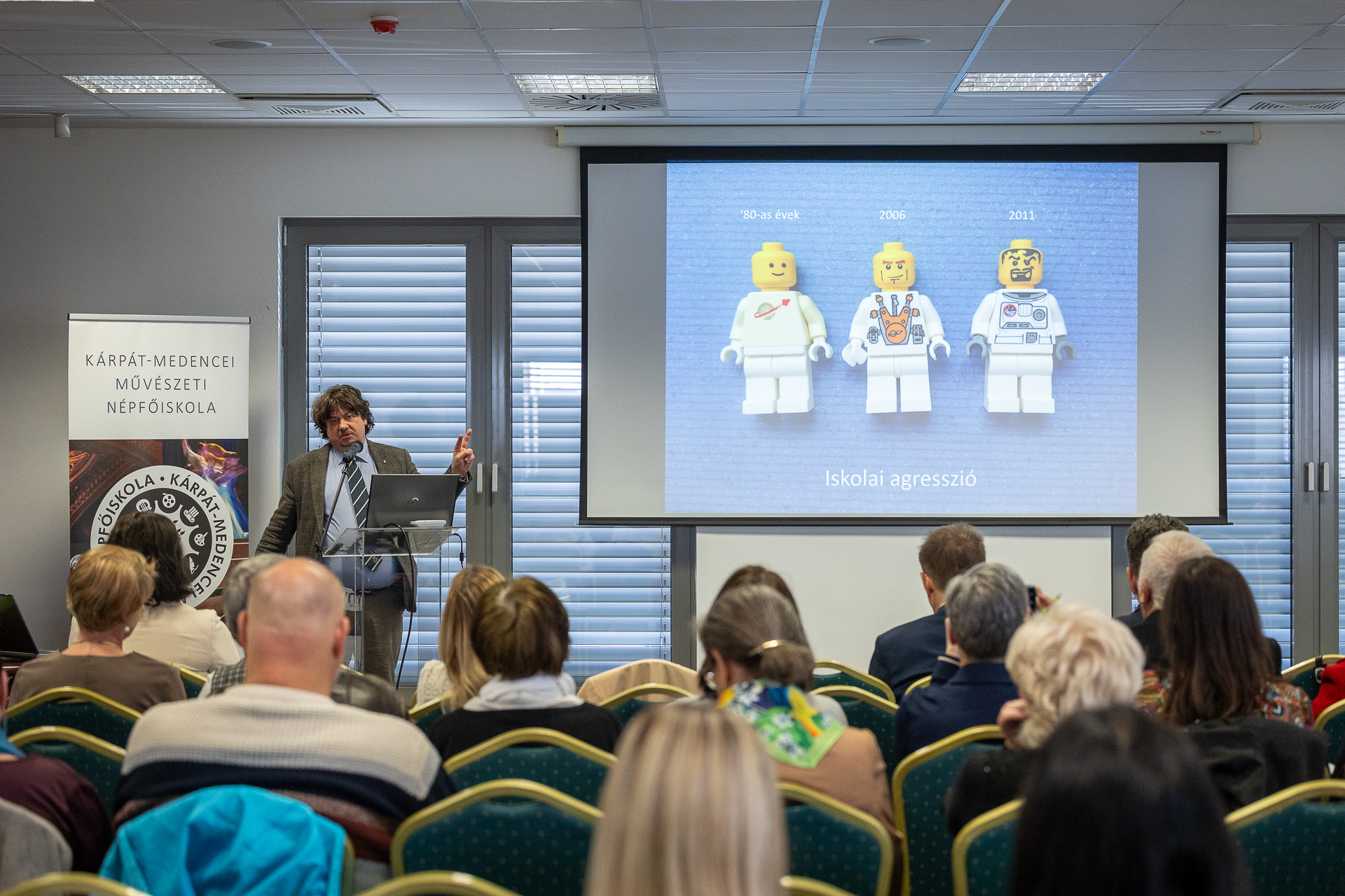L. Simon László felütése azonban csak a kezdőmondata volt annak a párbeszédnek, melyet Dr. habil Jancsák Csaba folytatott. Az ifjúságkutató előadása alatt síri csend volt: elnémult ugyanis a közönség azoktól a statisztikai adatoktól, amelyek a gyermekeket érő napi agresszió mértékét, az értékrendbeli változásokat, a hűség, mint jelentésteli fogalom évek alatti elértéktelenedését mutatták be. A számok mögött kirajzolódó valóság súlya szinte tapinthatóvá vált – egy pillanatra mindenki szembesült azzal, milyen világban nőnek fel a gyermekeink. A teremben nemcsak csend volt, hanem döbbenet és felelősségérzet is: annak felismerése, hogy nem fordíthatjuk el többé tekintetünket.