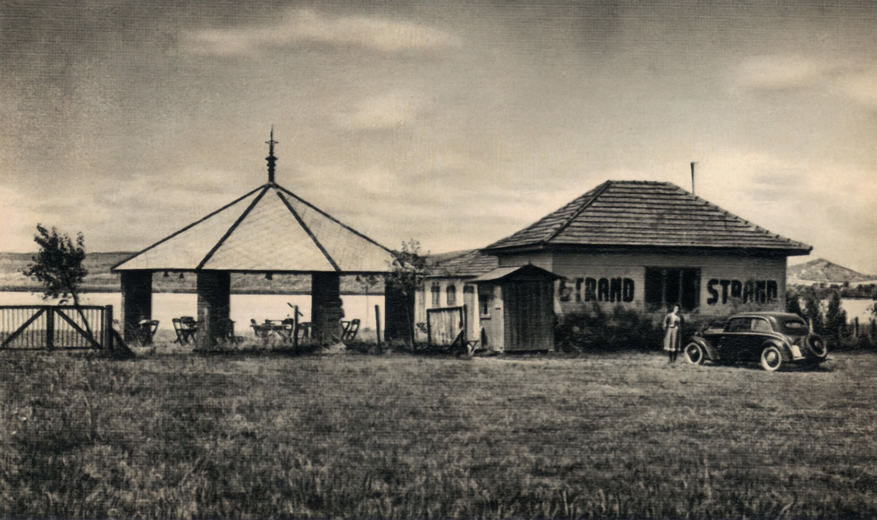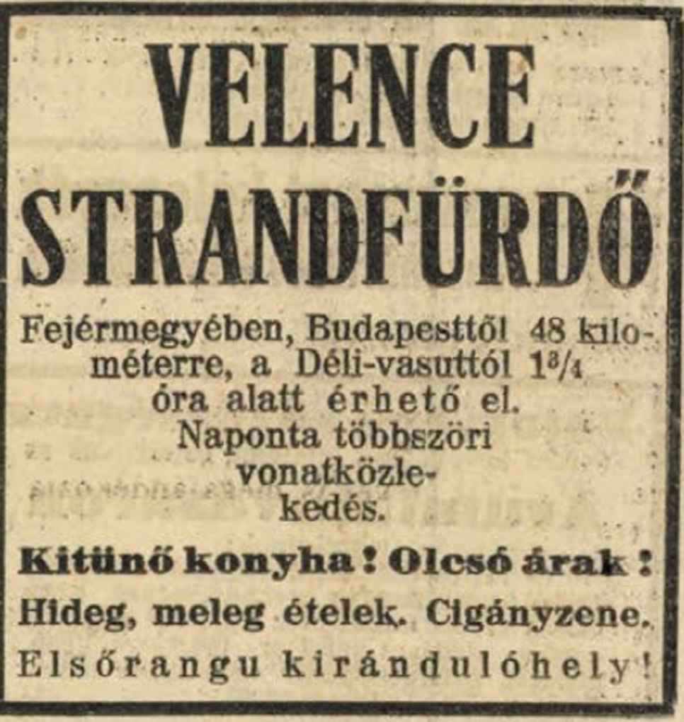 Hogy a strandlétesítés ötlete honnan származott, nem tudni, az viszont biztos, hogy a kivitelezés, a strand helyének kiválasztása, a strandolók igényeinek figyelembevétele, a megnyitás megszervezése és hírverése ötletességet és nagy céltudatosságot mutat. Nem mulasztották el széles körben terjeszteni a tó vizének gyógyhatását sem. A régi velencei vasútállomástól 50 méterre kezdődött a 400 méteres parton kialakított strand. Parkosított terület, öltözőkabinok sora, étterem, fedett terasz és ácsolt táncparkett állt a vendégek rendelkezésére. A hirdetésekből tudjuk, hogy rendszeresen játszott a strandon cigányzenekar.